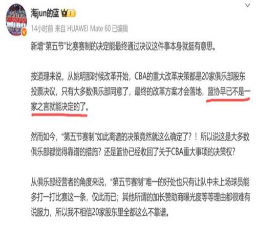 对此,媒体人海jun的蓝也更新社媒谈及此事,他表示:从姚明那时候改革开始,CBA的重大改革决策都是20家俱乐部股东投票决议,只有大多数俱乐部同意了,最终的改革方案才会落地,篮协早已不是一家之言就能决定的了。但如今,“第五节赛制”如此离谱的决策竟然就这么确定了。真要到了赛季开始,球迷也很难再会继续留下看年轻球员打所谓的第五节,电视机前的观众也大概率会关闭电视选择尽早休息,这个时候赞助商的曝光度没有任何意义。