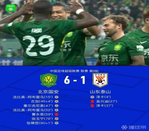 本场比赛是国安上半赛季的高光时刻,在上轮4-4遭三镇绝平后,北京国安在主场迎来了老对手山东泰山的挑战。泽卡第4分钟首开记录打入了泰山队全场比赛的唯一进球,随后吴兴涵与泽卡连续遭红牌罚下,接下来的比赛也成为了国安队单方面的表演,最终6-1大胜。