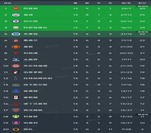 随着红魔21水晶宫,蓝军11枪手,英超第13轮最新积分榜如下!