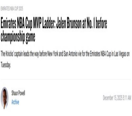 北京时间12月15日,NBA官网公布了杯赛MVP的最后一期实力榜。如今杯赛将进入决赛阶段,尼克斯和马刺将决出冠军的归属。按照赛事的一贯规律,凡是能助力球队夺冠且表现极为出色的球员,最终必将捧起MVP奖杯。这份荣誉的归属,将在尼克斯与马刺这两支晋级决赛的球队之间产生——两队阵中都不乏具备杯赛MVP竞争力的球员。