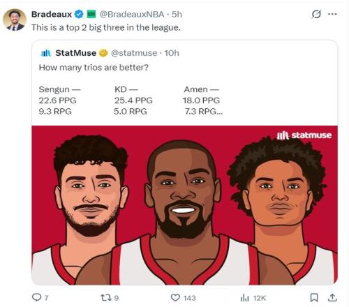 火箭记者Bradeaux转发后写道:这是联盟前二的三巨头组合。