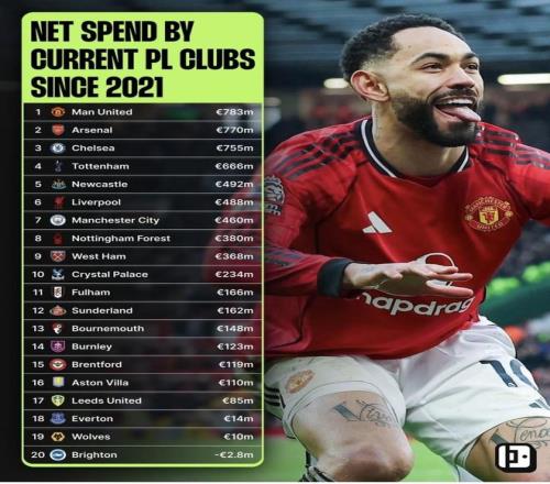 2021年来现有英超俱乐部的转会净支出榜单出炉!曼联妥妥冤大头
